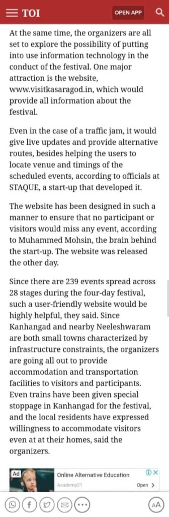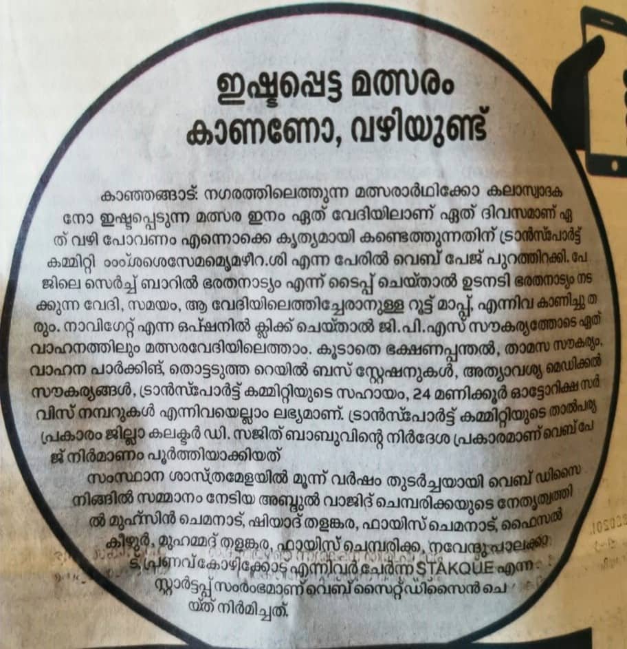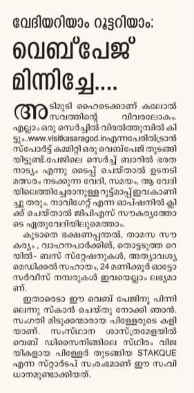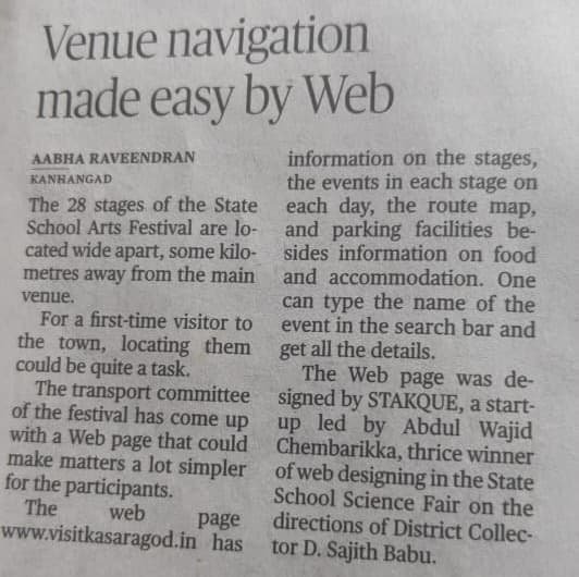 The website visitkasaragod.in is a huge success and an article about Stakque Technologies is Published in Some of the major Media.